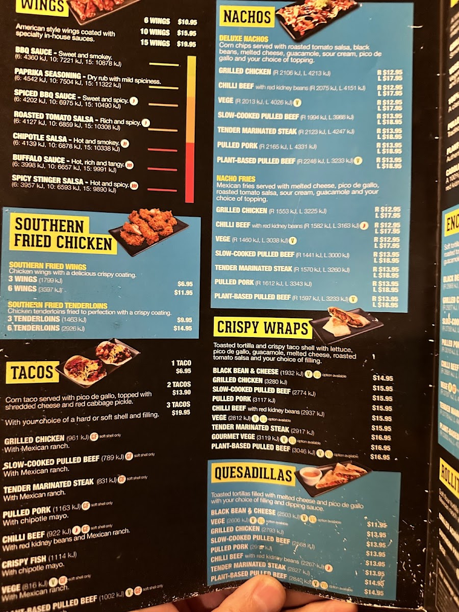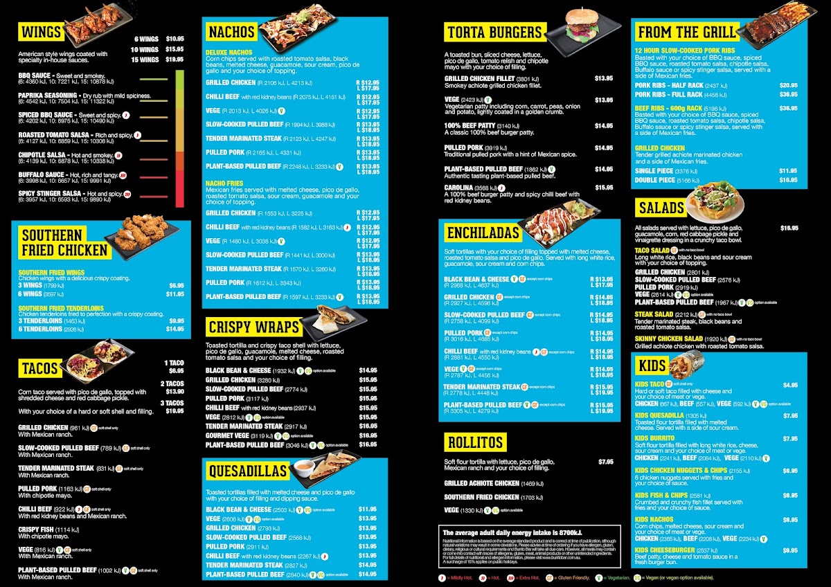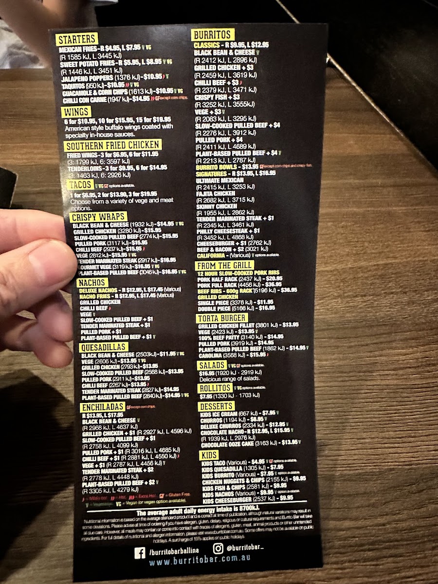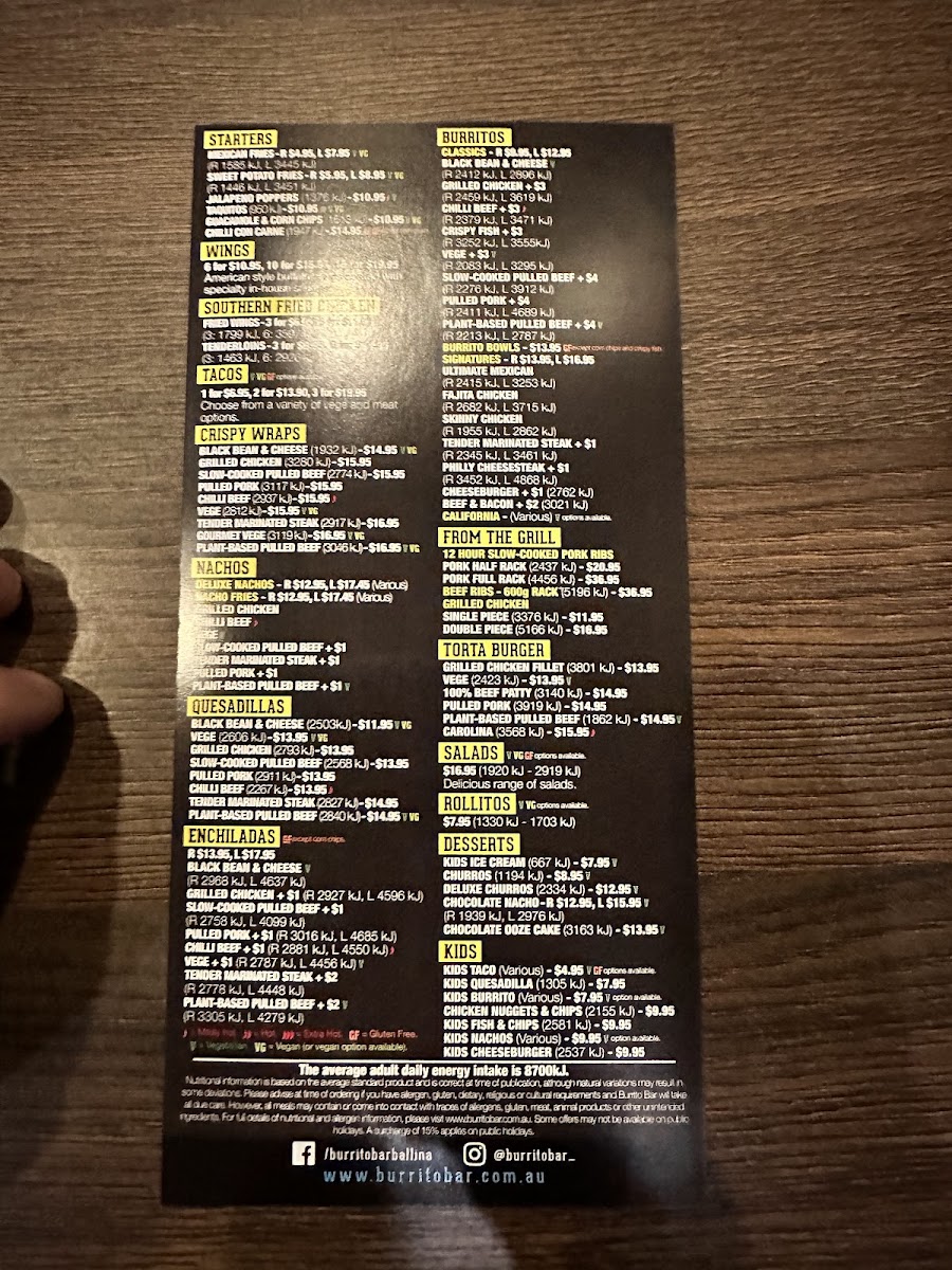 The menu at Burrito Bar Ballina offers a wide variety of flavorful options, perfect for anyone craving a delicious Mexican-inspired meal. For starters, you can enjoy dishes like the Habanero Chicken Wings or Mini Crispy Wrap, while the Tacos & Sliders section features choices like the 1 Taco or 3 Tacos. For something heartier, try the Beef Ribs and Fries or the tender 12 Hour Slow-Cooked Pork Ribs and Fries. There are also tasty Wings such as the Southern Fried Wings, and for a lighter bite, the Grilled Chicken Slider or Beef Torta are excellent options. If you're in the mood for nachos, the Large Deluxe Nachos or Large Nacho Fries are great picks. The restaurant also offers specialty dishes like Crispy Wraps, Tortas, and Quesadillas, all packed with flavor. For those with a sweet tooth, there are drinks like Jarritos and Lipton Peach Iced Tea, and sides such as Long White Rice or Kids Fish and Chips. Whether you're indulging in the larger Signature Burrito or enjoying a lighter snack like Sweet Potato Fries, Burrito Bar Ballina caters to all tastes with satisfying and bold flavors.