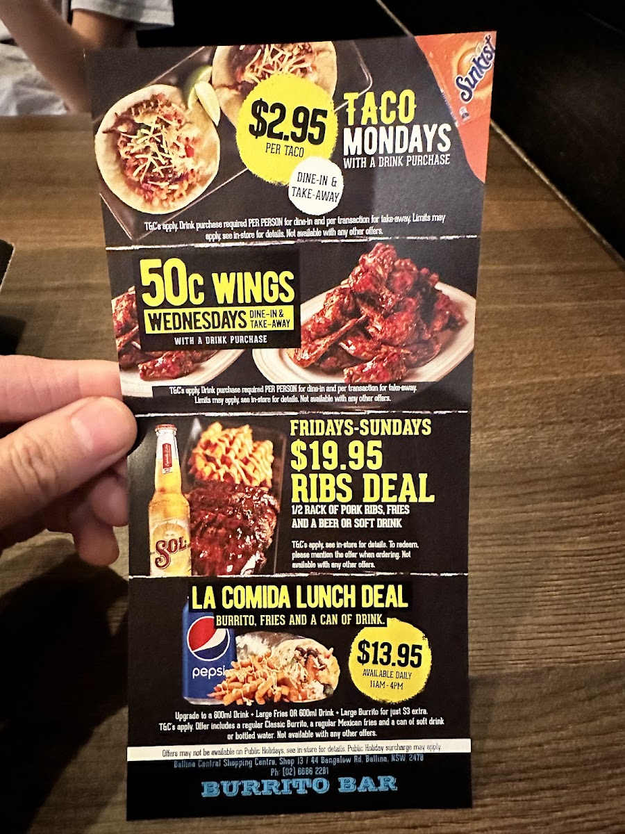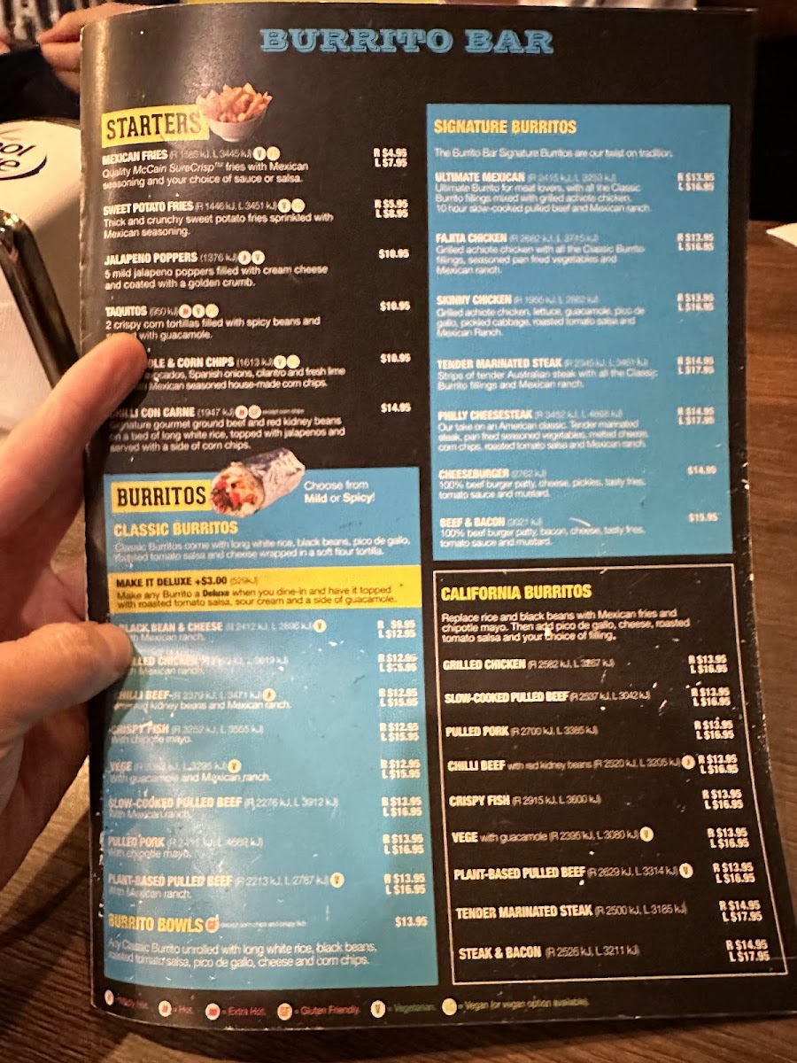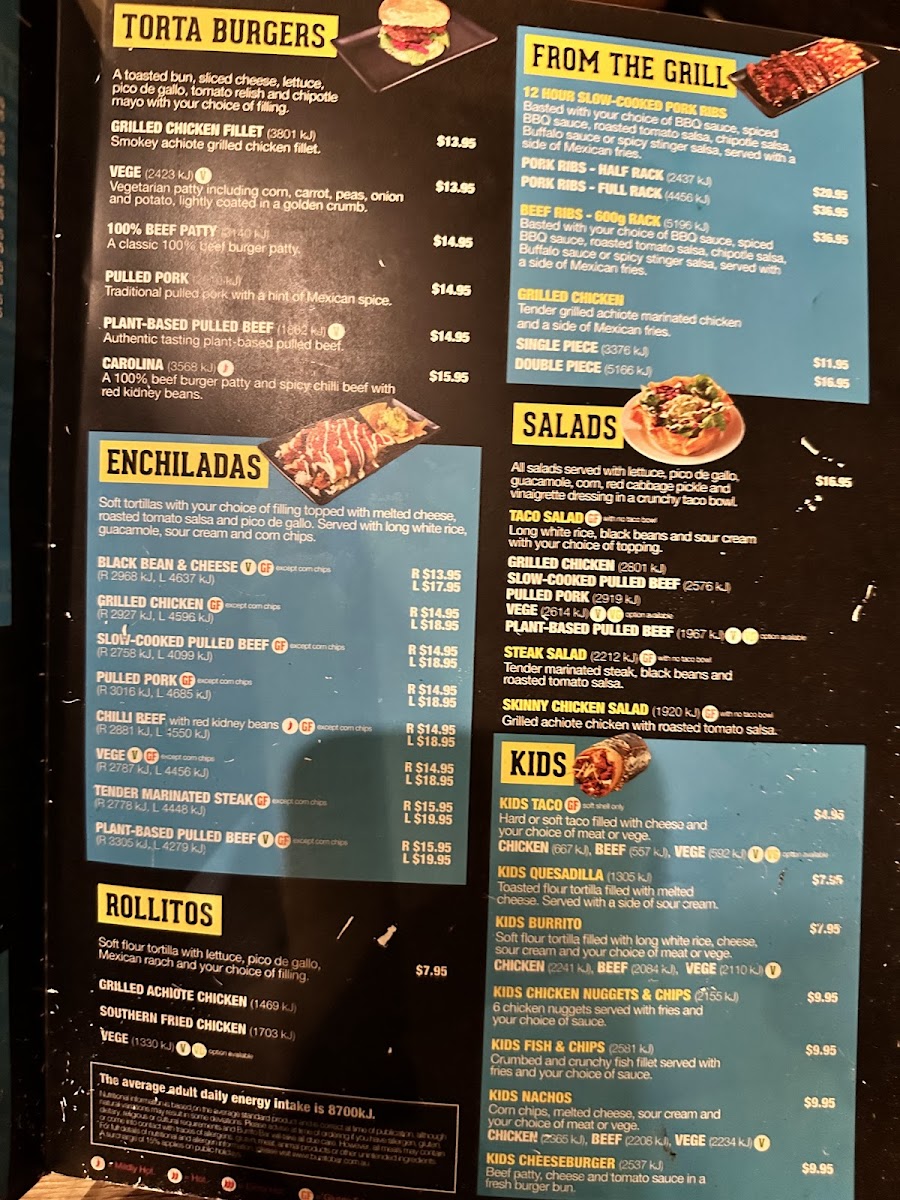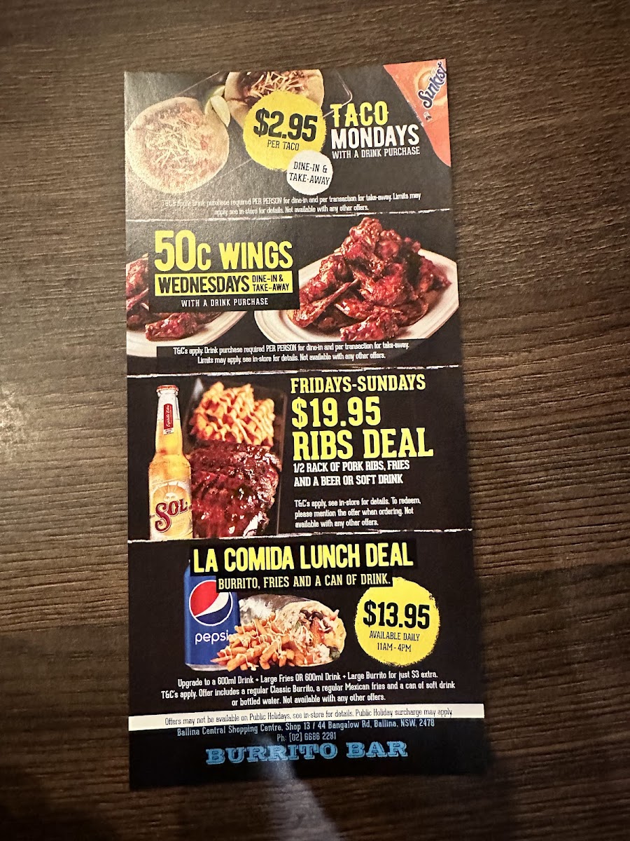 The menu at Burrito Bar Ballina offers a wide variety of flavorful options, perfect for anyone craving a delicious Mexican-inspired meal. For starters, you can enjoy dishes like the Habanero Chicken Wings or Mini Crispy Wrap, while the Tacos & Sliders section features choices like the 1 Taco or 3 Tacos. For something heartier, try the Beef Ribs and Fries or the tender 12 Hour Slow-Cooked Pork Ribs and Fries. There are also tasty Wings such as the Southern Fried Wings, and for a lighter bite, the Grilled Chicken Slider or Beef Torta are excellent options. If you're in the mood for nachos, the Large Deluxe Nachos or Large Nacho Fries are great picks. The restaurant also offers specialty dishes like Crispy Wraps, Tortas, and Quesadillas, all packed with flavor. For those with a sweet tooth, there are drinks like Jarritos and Lipton Peach Iced Tea, and sides such as Long White Rice or Kids Fish and Chips. Whether you're indulging in the larger Signature Burrito or enjoying a lighter snack like Sweet Potato Fries, Burrito Bar Ballina caters to all tastes with satisfying and bold flavors.